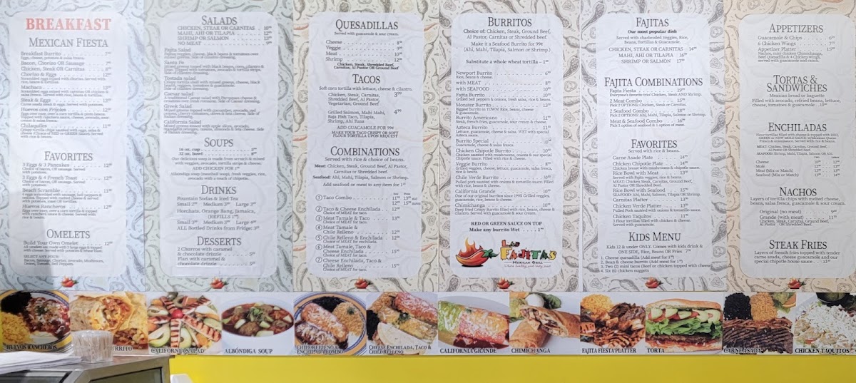 Las Fajitas Restaurant in Lake Forest offers a menu that strikes a balance between classic Mexican comfort foods and more indulgent specialties, making it easy for diners to find something for every craving. Appetizers like Guacamole & Chips and 6 Chicken Wings set the tone, while the Appetizer Platter provides variety for groups. The nachos selection, including Original Nachos and Grande Nachos, pairs well with sides like Steak Fries. Salads such as the Fajita Salad, Santa Fe, Tostada Salad, Caesar Salad, and Greek Salad offer lighter options. Breakfast fans will enjoy hearty dishes like Breakfast Burrito, Chorizo & Eggs, Machaca, Steak & Eggs, and Huevos Con Frijoles. Soups, including Menudo Grande, Albondiga Soup 16 Oz, Veggie Soup 16 Oz, and Chicken Soup 16 & 32 Oz, bring warmth and comfort.