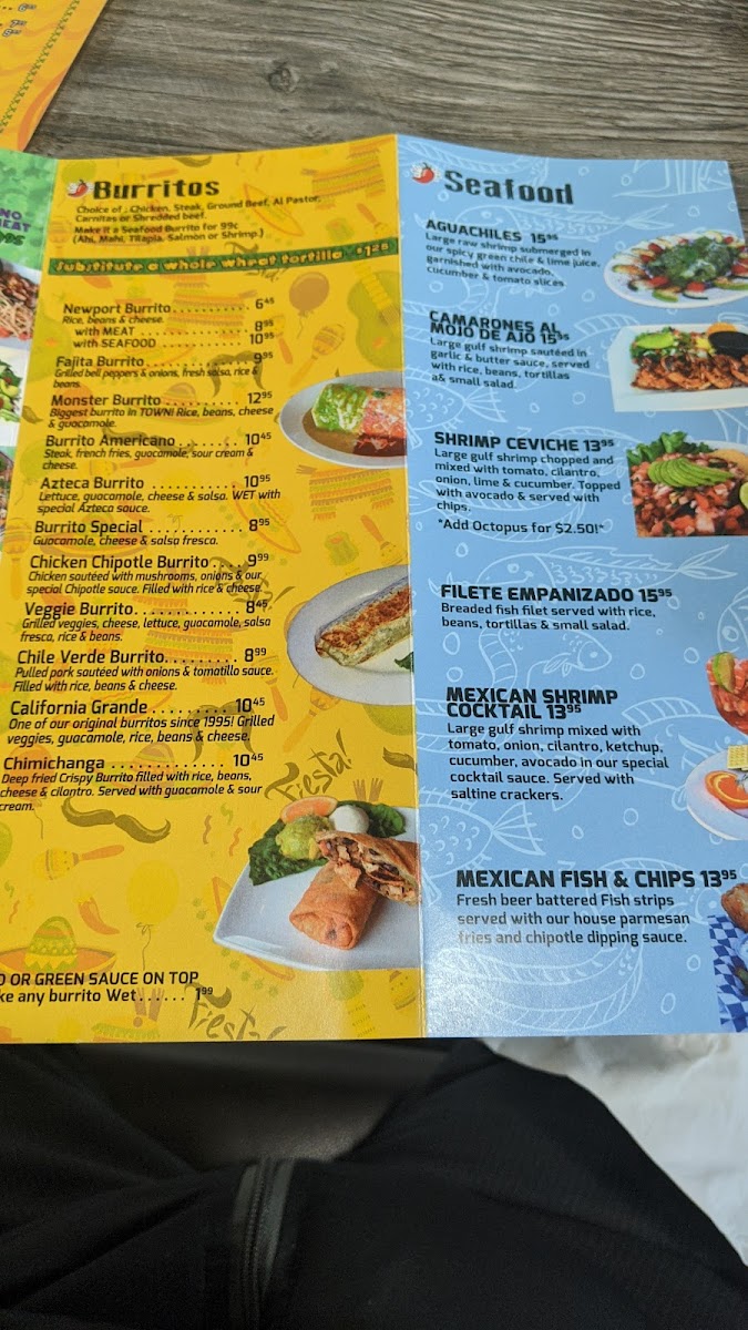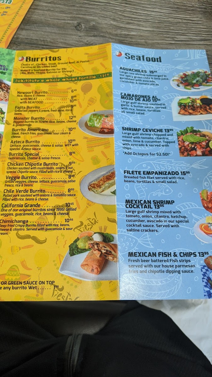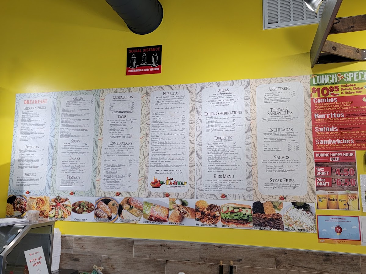 Burritos, from the Newport Burrito to the oversized Monster Burrito, provide generous portions, while enchiladas such as Seafood Enchilada (2), Cheese Enchilada (2 or 3), and Mole Enchilada (2 or 3) showcase rich flavors. Fajitas highlight proteins like Tilapia, Salmon, Chicken, Steak, and Carnitas, with favorites including Carne Asada Plate, Bistec Ranchero, 3 Chicken Taquitos Rice And Beans, Rice Bowl w/ Seafood, and Carnitas Platter rounding out main options. Lunch specials like Combo Soup & Taco (LS) and Cheese Enchilada w/ Salad (LS) make midday dining approachable.